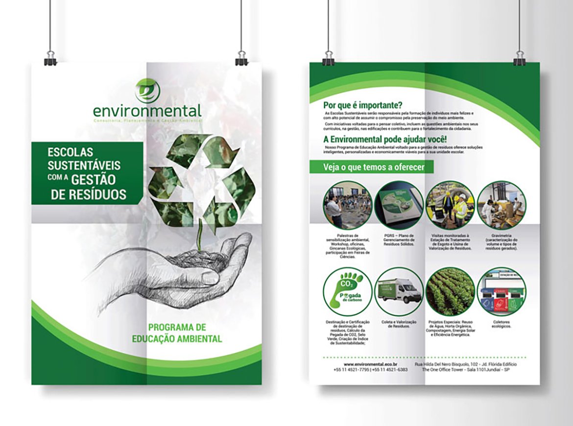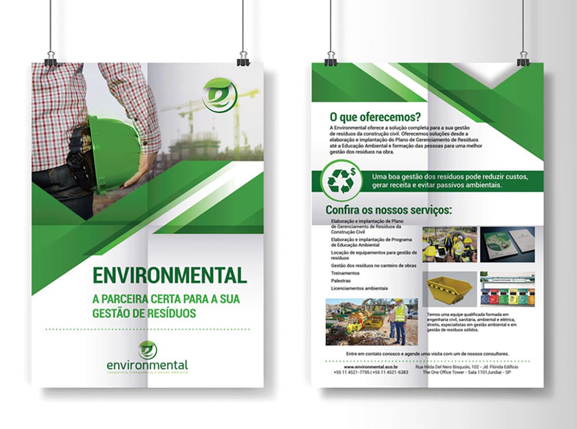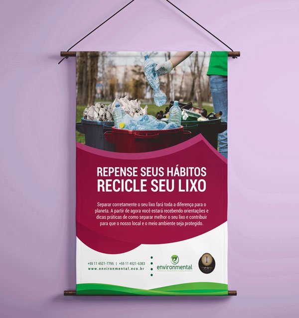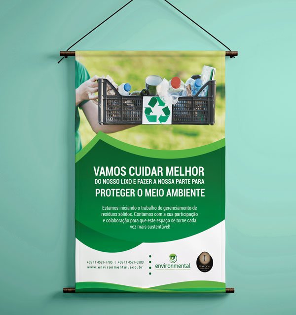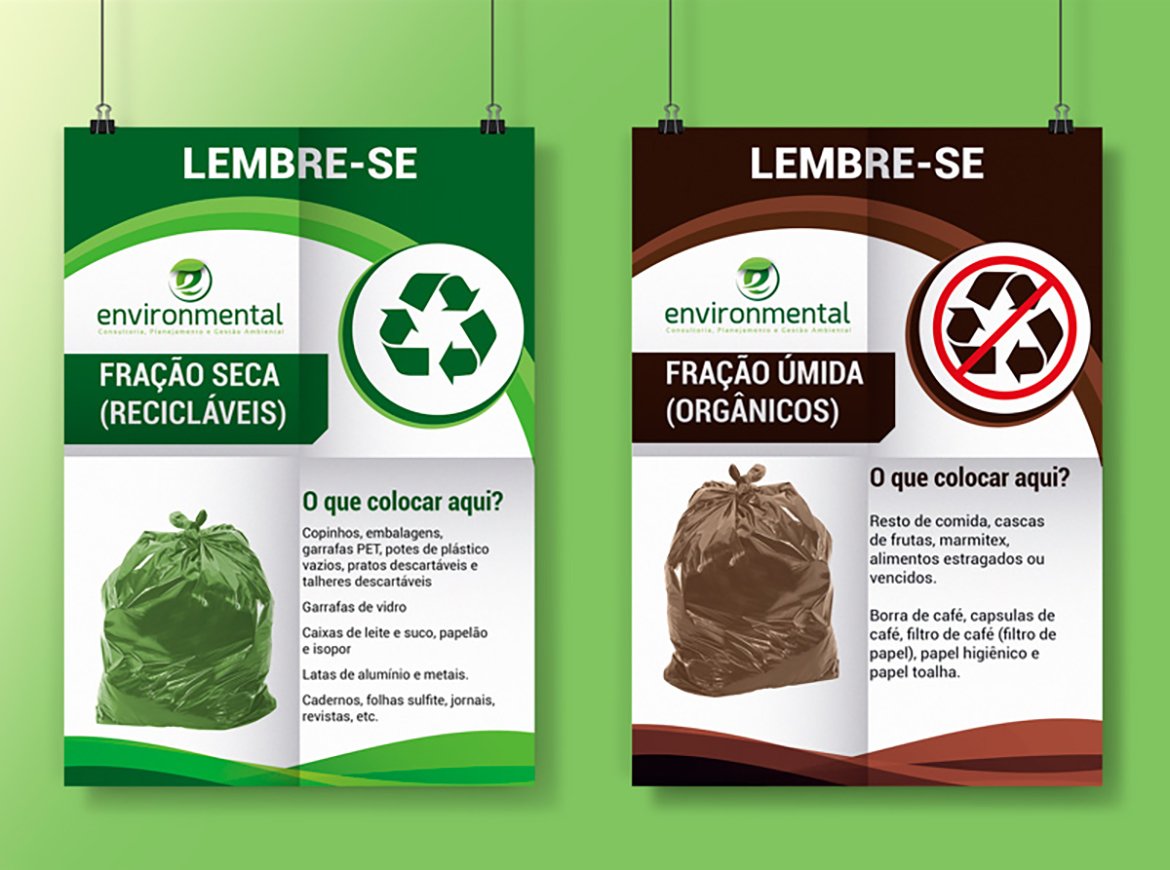 Para esse projeto, eu fiquei responsável por desenvolver o padrão da comunicação visual da empresa. O objetivo era criar materiais impressos com foco em mostrar os processos da gestão de resíduos dentro das empresas, além de banners informativos com quadros de avisos para orientar funcionários a forma correta de descartar os resíduos produzidos.